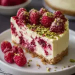 Ein köstlicher und erfrischender Cheesecake mit Himbeeren und Pistazien, der ganz ohne Backen auskommt.