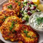 Diese knusprigen Kartoffel-Feta-Puffer sind ein Genuss voller Geschmack, serviert mit einer erfrischenden Joghurt-Gurken-Sauce.