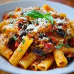 Nudeln alla Norma mit Auberginen und frischer Tomatensoße auf einem Teller