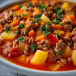 Es gibt Momente, die einfach nach herzhaftem Komfort essen verlangen, und wenn ich an solche Zeiten denke, stelle ich mir den Russischen Hackfleischtopf vor. Der köstliche Duft von angebratenen Zwiebeln und Knoblauch erfüllt die Luft und lässt mir das Wasser im Mund zusammenlaufen. Bereits beim ersten Bissen spüre ich die Aromen der saftigen Fleischbällchen, die sich perfekt mit süßen, weichen Karotten und dem knackigen Biss der Paprika verbinden. Die cremige Textur der frischen Tomaten und die sanfte Brühe machen dieses Gericht zu einem Fest für die Sinne, während die frische Petersilie darauf wartet, das Gericht mit ihrem satten Grün zu verfeinern.